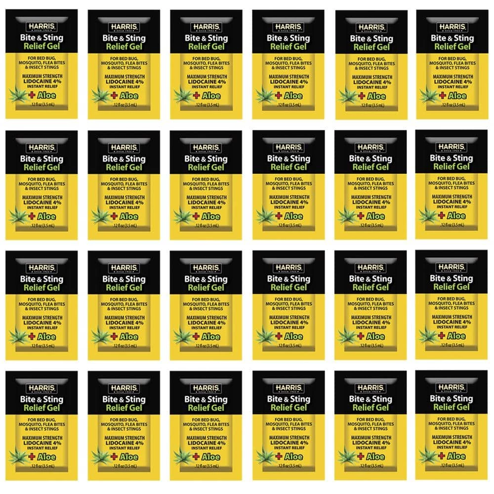 Harris Insect Bite and Sting Relief Gel provides instant relief for pain and itching. 0.12 oz. personal size (24 Pack) treats multiple bed bug, spider, mosquito, or flea bites. Lidocaine (4%) with Aloe formula is fast acting and long lasting. Harris Insect Bite and Sting Relief Gel is easy to apply with no irritation, no burning, and non-greasy.