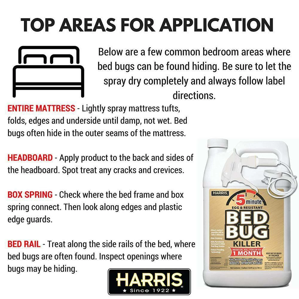 Harris 5-Minute Egg and Resistant Bed Bug Killer, 1 Gal. ready to use, kills all bed bug life stages: adults, nymphs and eggs. This new generation insecticide is used by Professional Exterminators. It is effective for residential and commercial use and it kills bed bugs in 5-minutes. Treat directly on mattresses, seams, folds, box springs, furniture, carpet edges, closets, baseboards, pet areas, luggage, backpacks and shoes. Residual spray is long-lasting, odorless and non-staining. Harris Professional 32 oz. sprayer sprays a powerful stream or a fine mist. The bottle is chemically resistant to hold a variety of chemicals. Harris 55 oz. Home, Auto and Garden Pump Sprayer allows easy application of harsh cleaners, chemicals and solvents. The pump sprayer can be adjusted to spray a fine mist or jet spray. Easy to use design, just fill, pump and spray. Value-Pack for multiple treatments.