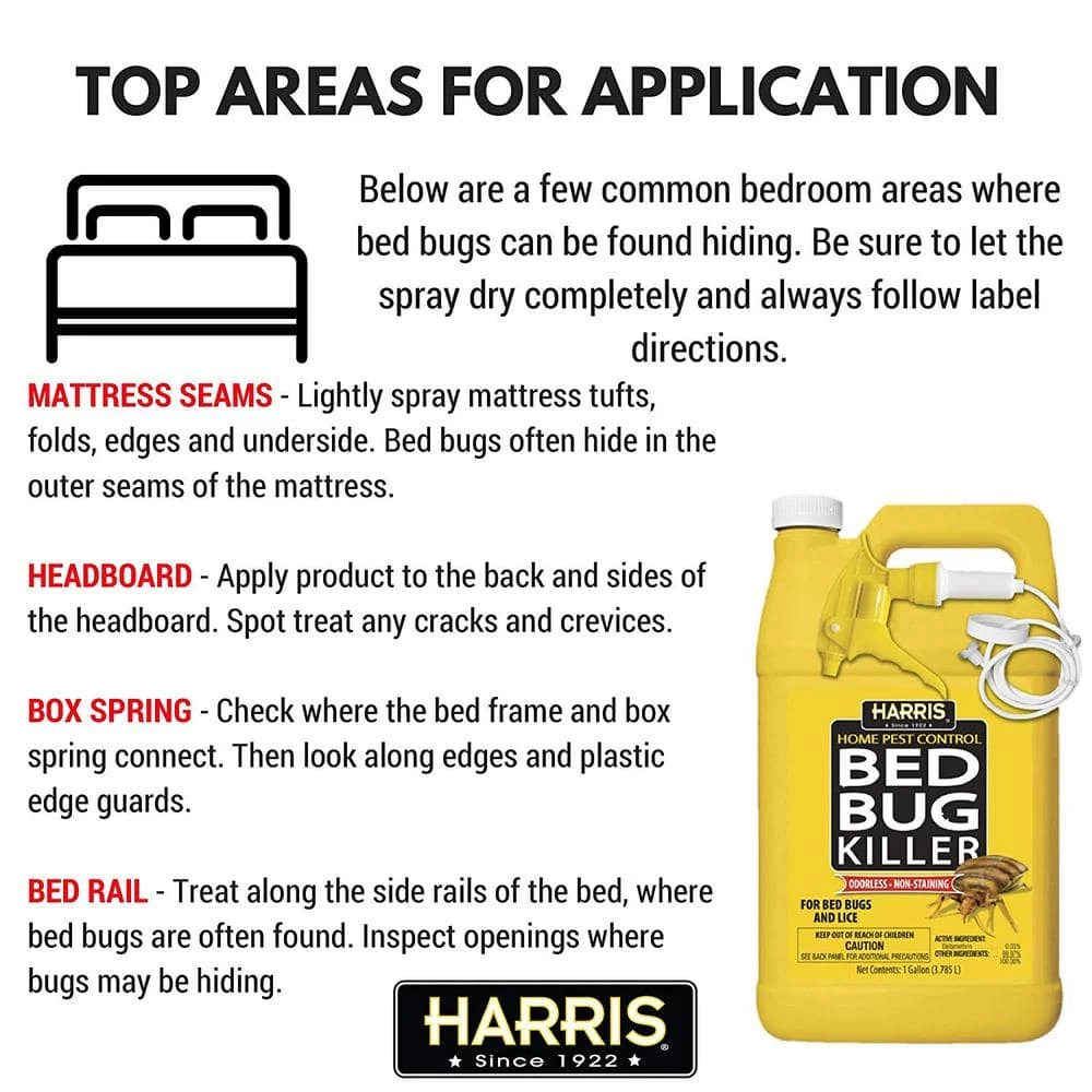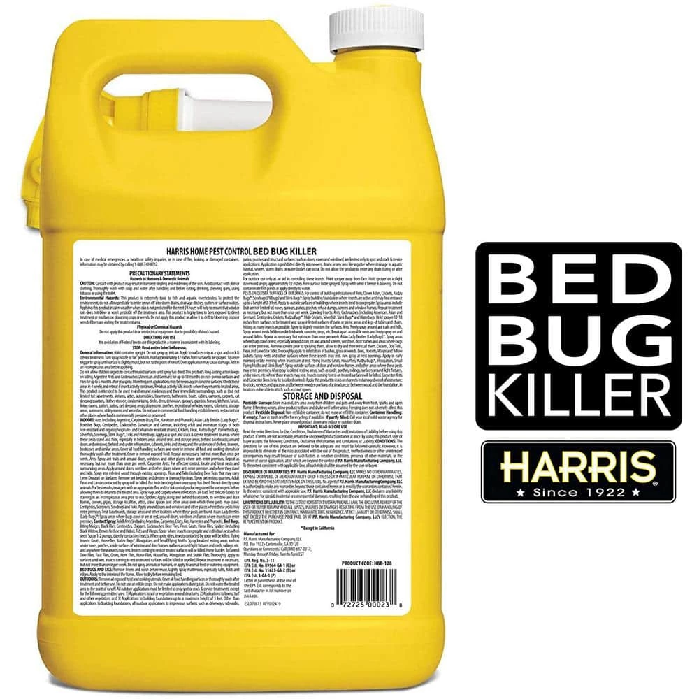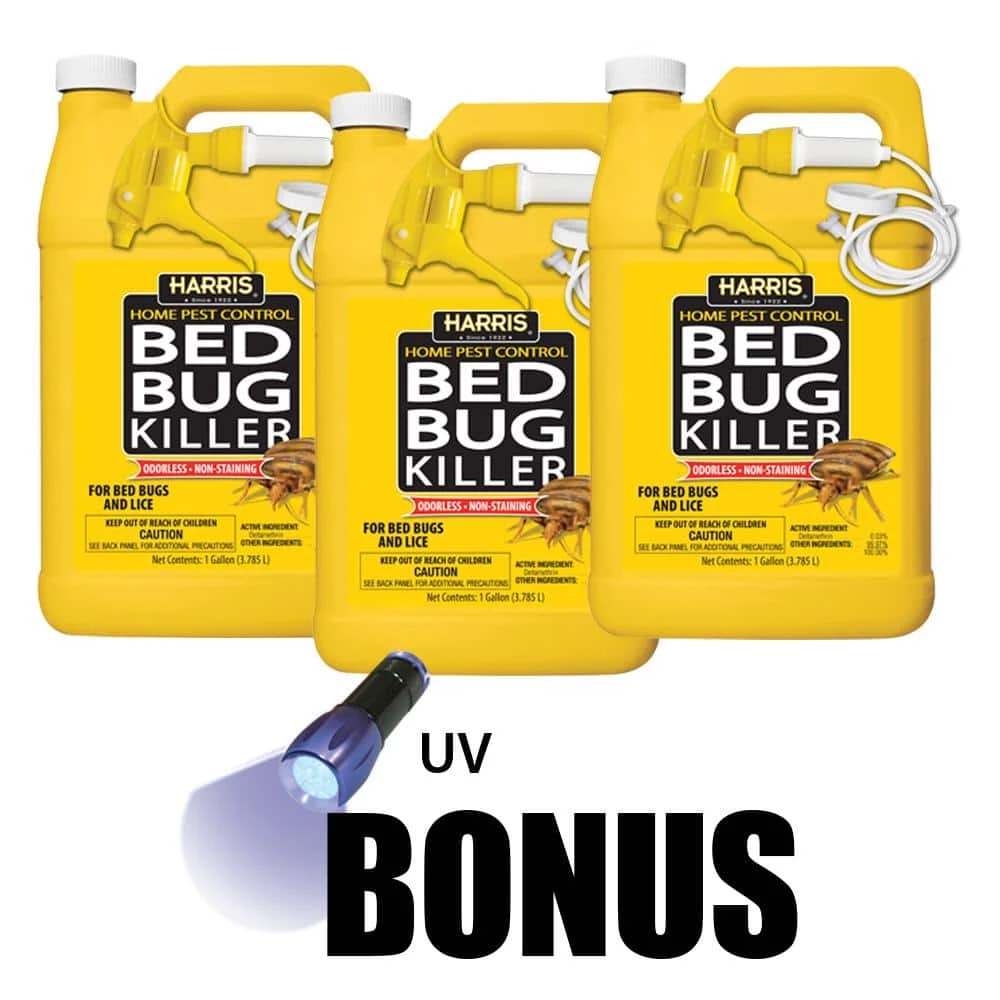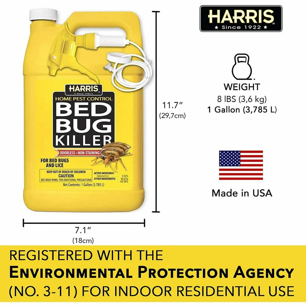The Harris 1-gal. Bedbug Killer (3 Pack) kills bedbugs and lice. The insecticide comes in a 1-gal. bottle with an easy-to-use spray trigger for convenient and immediate application. The formula is odorless and non-staining and can be used on many surfaces such as mattresses, box springs, carpets, walls and floors. Effective results begin after the spray dries.