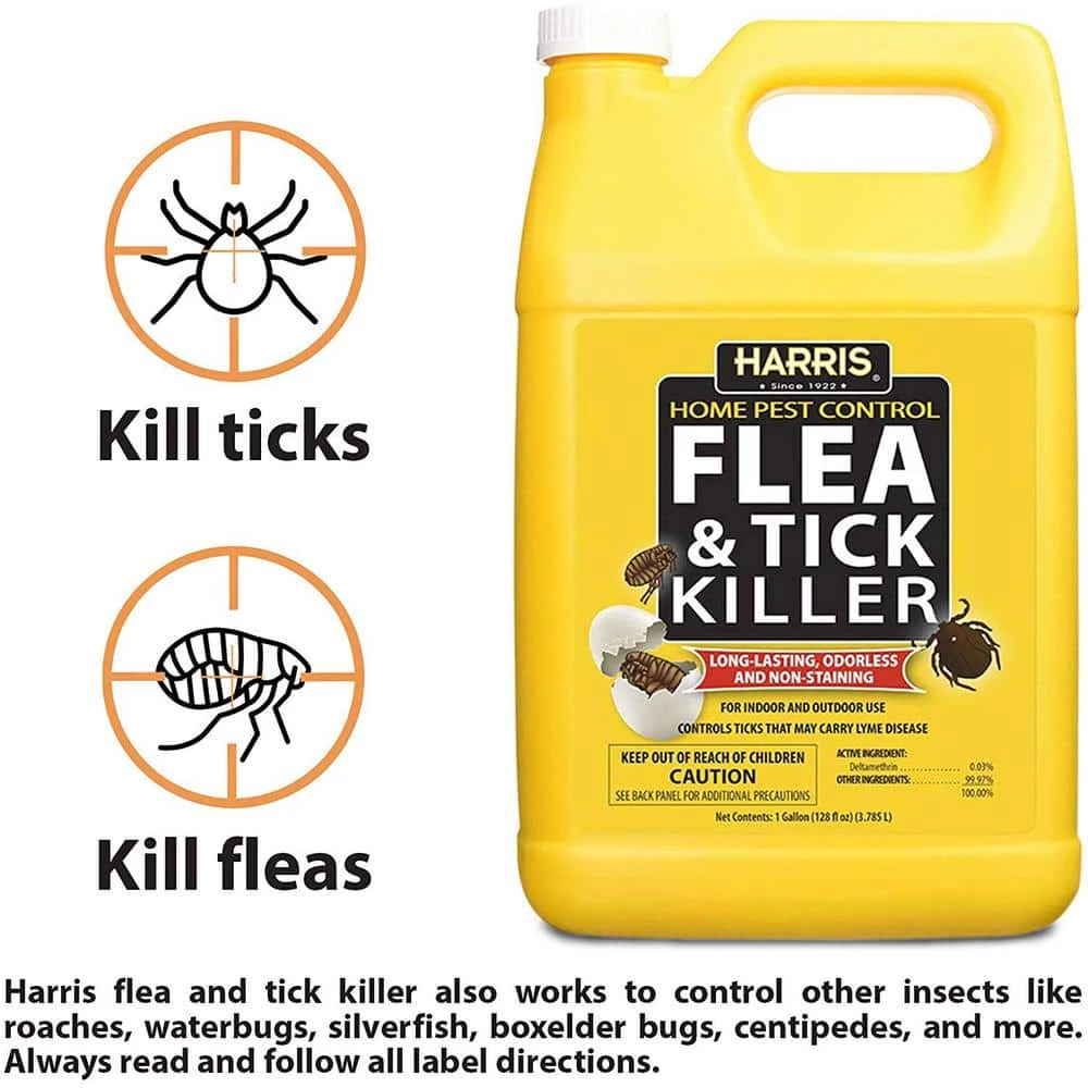 Help control ticks that may transmit Lyme disease with the Harris 1 Gal. Flea and Tick Killer. The flea and tick killer is long-lasting and odorless and is effective against ticks, fleas and other biting insects. This home pest-control solution is for indoor and outdoor use and can be used on carpets, rugs and pet resting quarters. Effective results begin, after the spray dries.