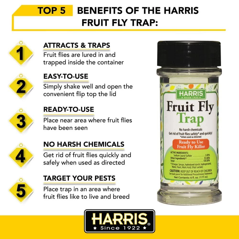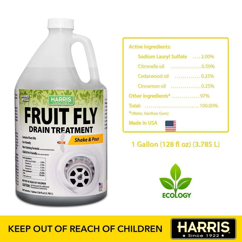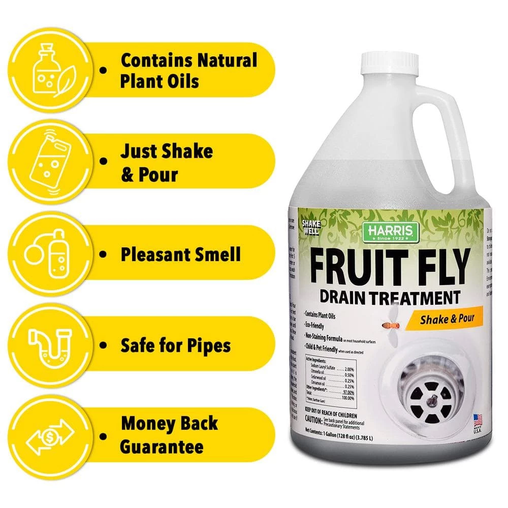 Harris Fruit Fly Drain Treatment Kills Fruit Flies and Drain Flies using Natural Plant Oils. Simply shake and pour 12 oz. at a time directly down your drain. Oils emit a light and pleasant scent to keep your drain smelling fresh. Safe for all pipes and drains.