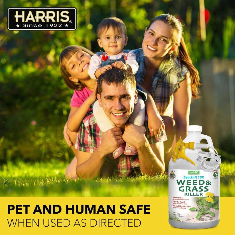 Harris Weed and Grass Killer is a non-selective herbicide designed specifically to target and kill unwanted weeds and grasses. It kills all common weeds including Broadleaf, Crabgrass, Dandelion, Clover, Ivy, Chickweed and many more. The Sea Salt Weed and Grass Killer works fast and kills weeds down to the roots. Great for around homes, flower beds, gardens, shrubs, trees, patios, pool areas, sidewalks, driveways and more. Treats up to 400 sq ft. per gallon. The Weed and Grass Killer is pet and human safe when used as directed. Professional 32 oz. sprayer sprays a powerful stream or a fine mist.
