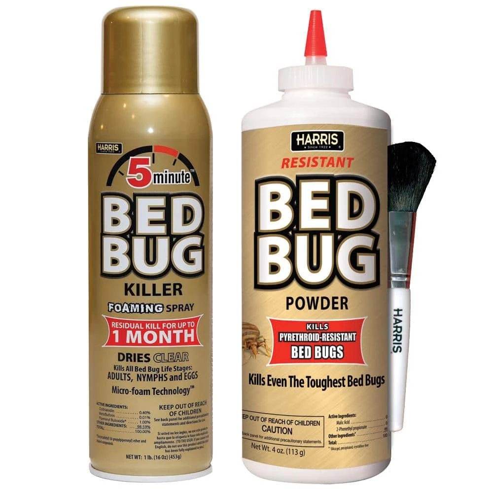 Harris 5-Minute Bed Bug Killer Value Pack includes a 16 oz. 5-Minute Bed Bug Killer Foaming Spray and a 4 oz. Resistant Bed Bug Powder. Harris 16 oz. 5-Minute Bed Bug Killer Foaming Spray is ready to use, kills all bed bug life stages: adults, nymphs and eggs. This new generation insecticide is used by Professional Exterminators. It is effective for residential and commercial use and it kills bed bugs in 5-minutes. Treat directly on mattresses, seams, folds, box springs, furniture, carpet edges, closets, baseboards, pet areas, luggage, backpacks and shoes. 1-Month Residual Foaming Spray is long-lasting, odorless, non-staining and dries clear. Harris 4 oz. Resistant Bed Bug Powder kills pyrethroid resistant bed bugs. The powder is long-lasting. Container covers approximately 200 sq. ft. Treats bed frames, mattresses, box springs, cracks and crevices, baseboards, moldings and hollow furniture legs. Easy to use applicator brush is included.