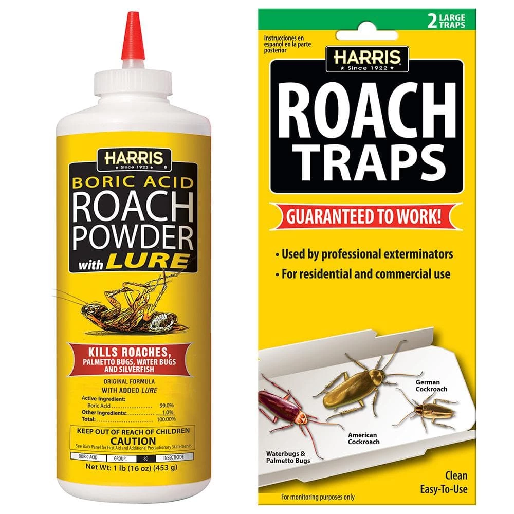 16 oz. Boric Acid Roach Powder with Lure and Roach Traps Value Pack will help rid your home of roaches and other pests. Powder also kills palmetto bugs, water-bugs, and silverfish. Insects coming into contact with the powder will die within 72 hours after initial contact. The traps are easy to use, and catch roaches. They are pesticide free. For commercial and residential use.