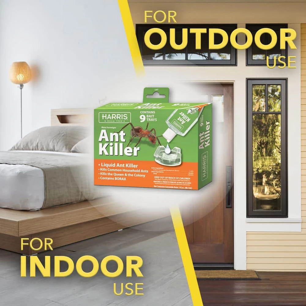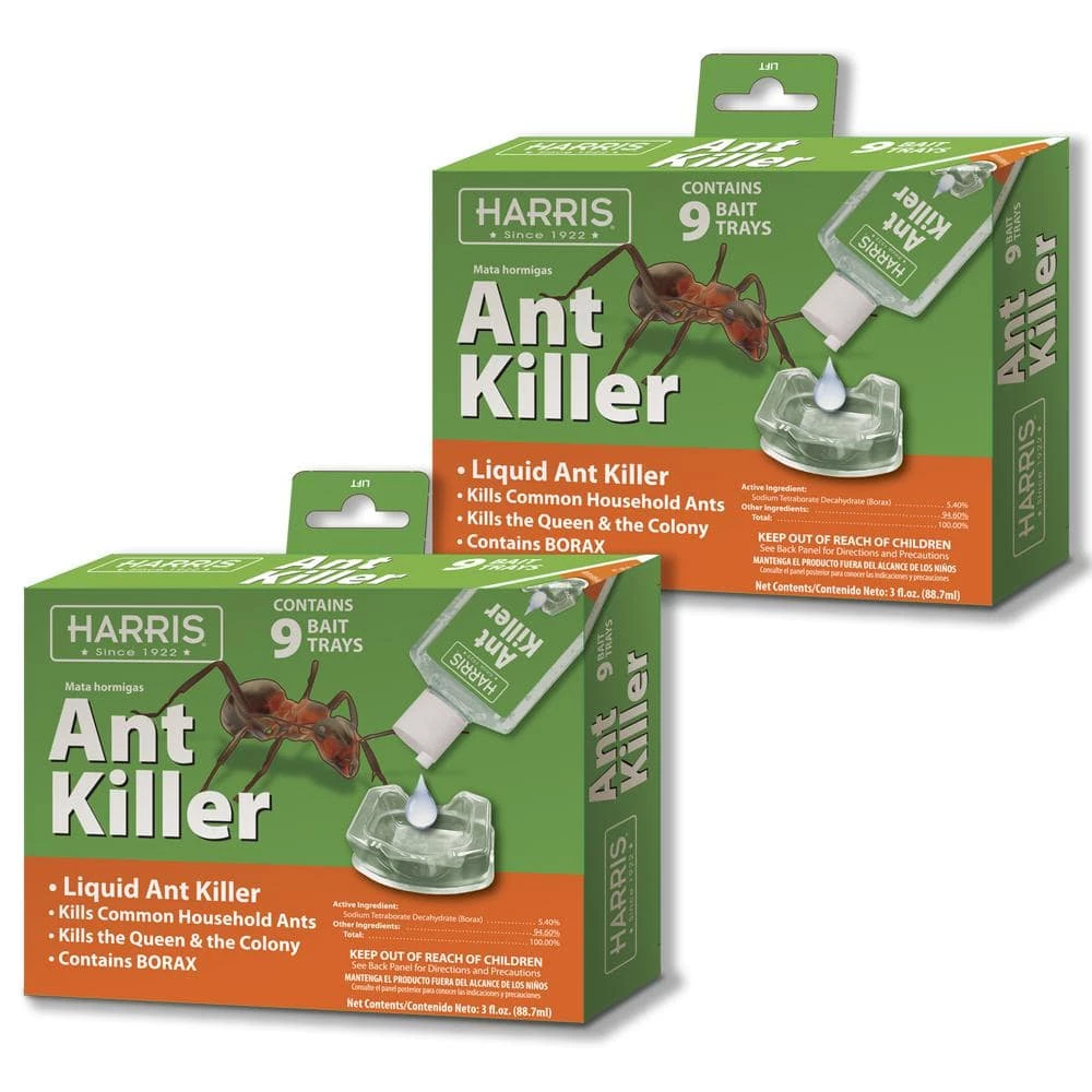Harris 3 oz. lquid ant killer 18 bait tray pack kills all common household ants. Apply around appliances, bathrooms, baseboards, corners, crawl spaces, dining rooms, kitchens, storage areas, garages, and other areas where ants may forage. Liquid ant kill, kills the Queen and the Colony. For residential and commercial use. Value 18-pack treats multiple areas.
