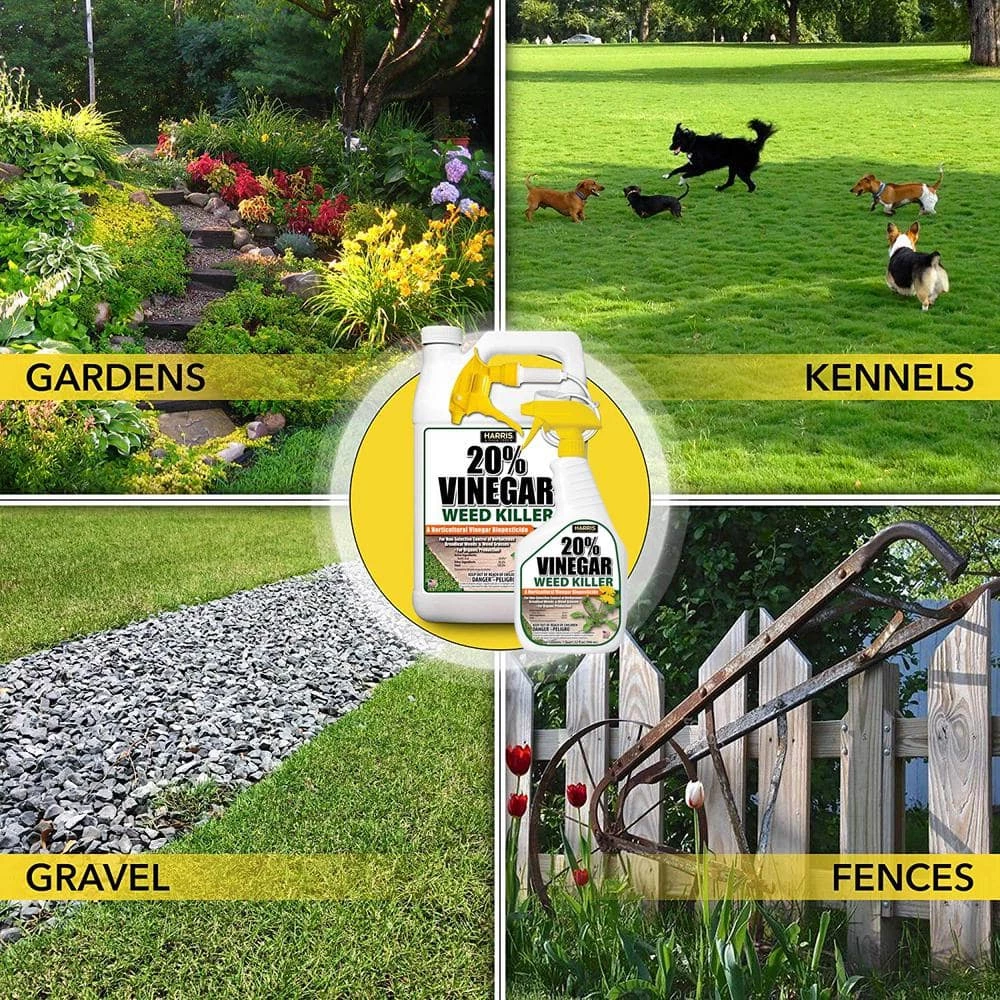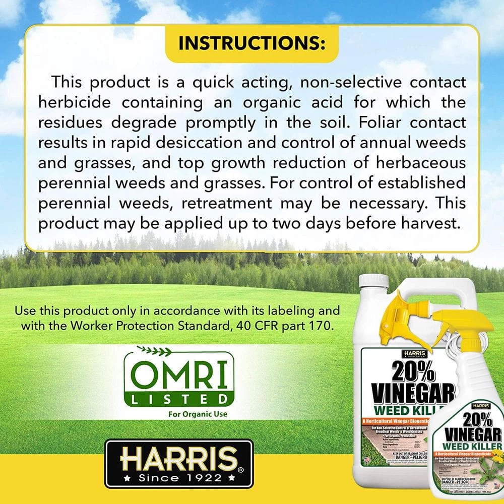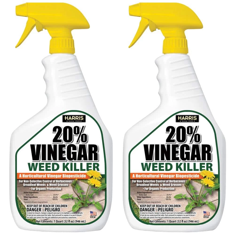 Harris 32 oz. 20% Vinegar Weed Killer is a horticultural vinegar biopesticide. 20% Vinegar Weed Killer is organic and fast-acting. It provides non-selective control of herbaceous broadleaf weeds and weed grasses. Spray this product on unwanted weeds (vegetation) to the point of wetness. Adjustable trigger sprayer included for easy application. Value 2-Pack for multiple treatments.