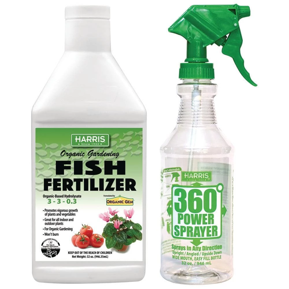 Harris Liquid Fish Fertilizer uses trace minerals and micronutrients naturally derived from fish to stimulate health growth in the root system of plants and vegetables. Its great for tomatoes and vegetables, 3-3-03. Also used for house plants, outdoor plants, lawns, trees and shrubs. Fish fertilizer is also a great compost starter. The 32 oz. 360° All Angle Professional Sprayer sprays upright, angled and upside down without leaking. Its heavy-duty to spray and resist chemicals, cleaners and solvents. The adjustable nozzle sprays a stream or a fine mist. Value Pack to treat multiple areas.