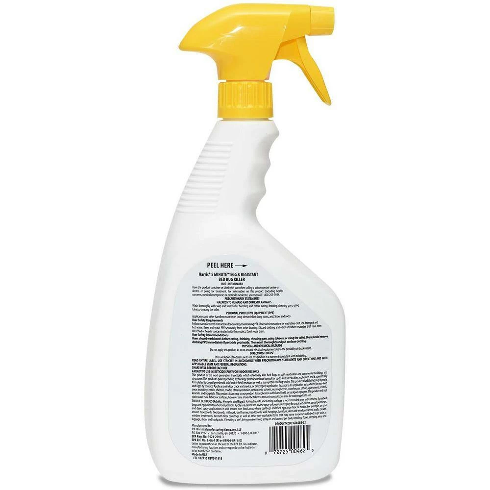 Harris 5-Minute Egg and Resistant Bed Bug Killer, 32 oz. ready to use, kills all bed bug life stages: adults, nymphs and eggs. This new generation insecticide is used by Professional Exterminators. It is effective for residential and commercial use and it kills bed bugs in 5-minutes. Treat directly on mattresses, seams, folds, box springs, furniture, carpet edges, closets, baseboards, pet areas, luggage, backpacks and shoes. Residual spray is long-lasting, odorless and non-staining. Insect Bite and Sting Relief Gel is easy to apply with no irritation, no burning, and non-greasy. Provides instant relief for pain and itching.