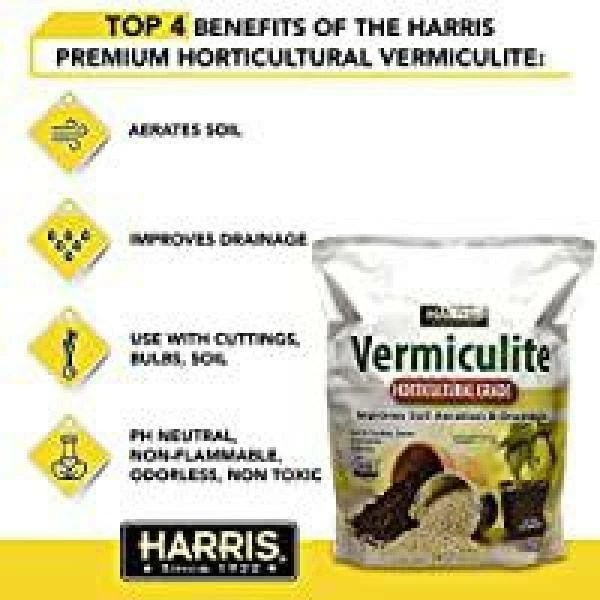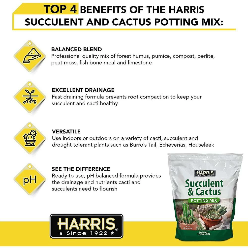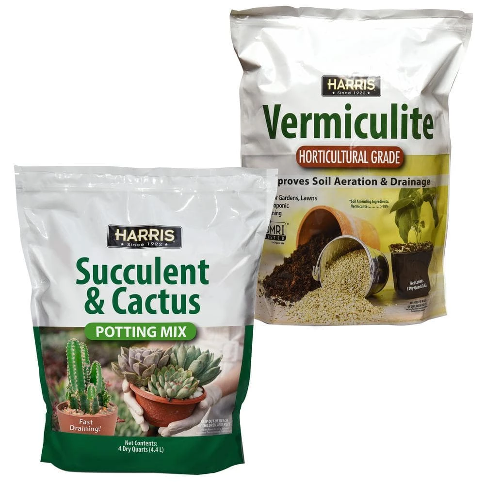 Harris Vermiculite Helps with soil aeration and drainage to keep your plants looking healthy. The Premium Horticultural Vermiculite is pH neutral, non-flammable, odorless, non toxic, and will not decay or shrink. Use with cuttings, bulbs, soil, composted bark and more. Listed with the Organic Minerals Research Institute for organic use.Harris Succulent and Cactus Potting Soil Mix is designed to provide the best possible drainage and stability for all your succulents and various cacti. As a balanced blend of premium quality Forest Humus, Pumice, Compost, Perlite, Sphagnum Peat Moss, Fish Bone Meal and Limestone, it boasts both excellent drainage and water holding capabilities. It is great for both indoor and outdoor cacti, succulents, and all drought tolerant plants. Because most succulents are slow growing, the key to healthy and optimal growth is well-drained soil.