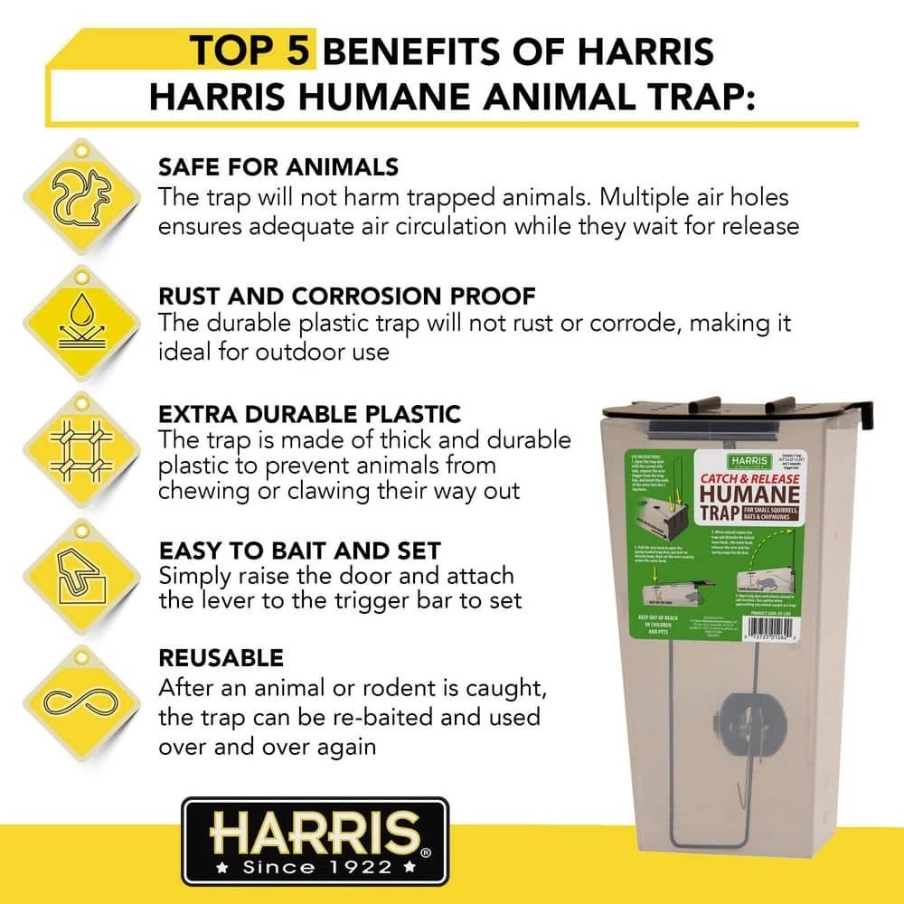 Harris Catch and Release Humane Squirrel and Rodent Trap is great for catching small squirrels, chipmunks, rats, mice and other rodents. It is easy to use, simply raise the door and attach the lever to the trigger bar to set. The trap is safe for animals, it can be re-baited and is reusable.