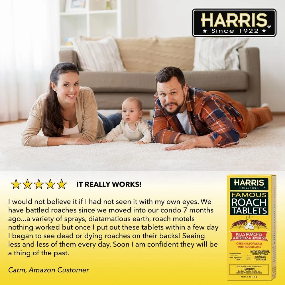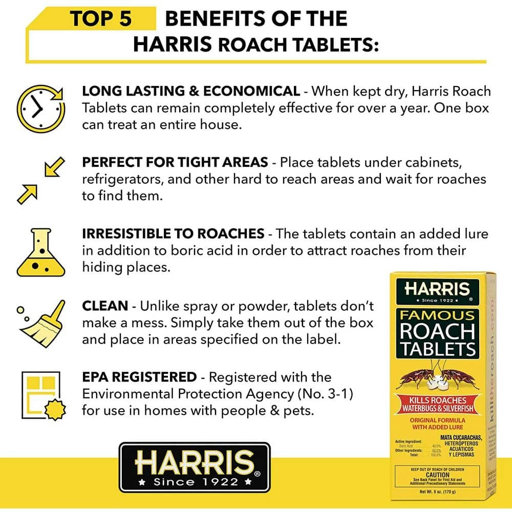 The Harris 6 oz. Famous Roach Tablets 12-Pack provides an easy and economical way to rid your entire house or business of common pests such as roaches, water bugs, and silverfish. Placing the tablets is a clean and efficient operation. This odorless formula helps you treat entire areas with no chemical smell.12-Pack value size treats multiple areas.