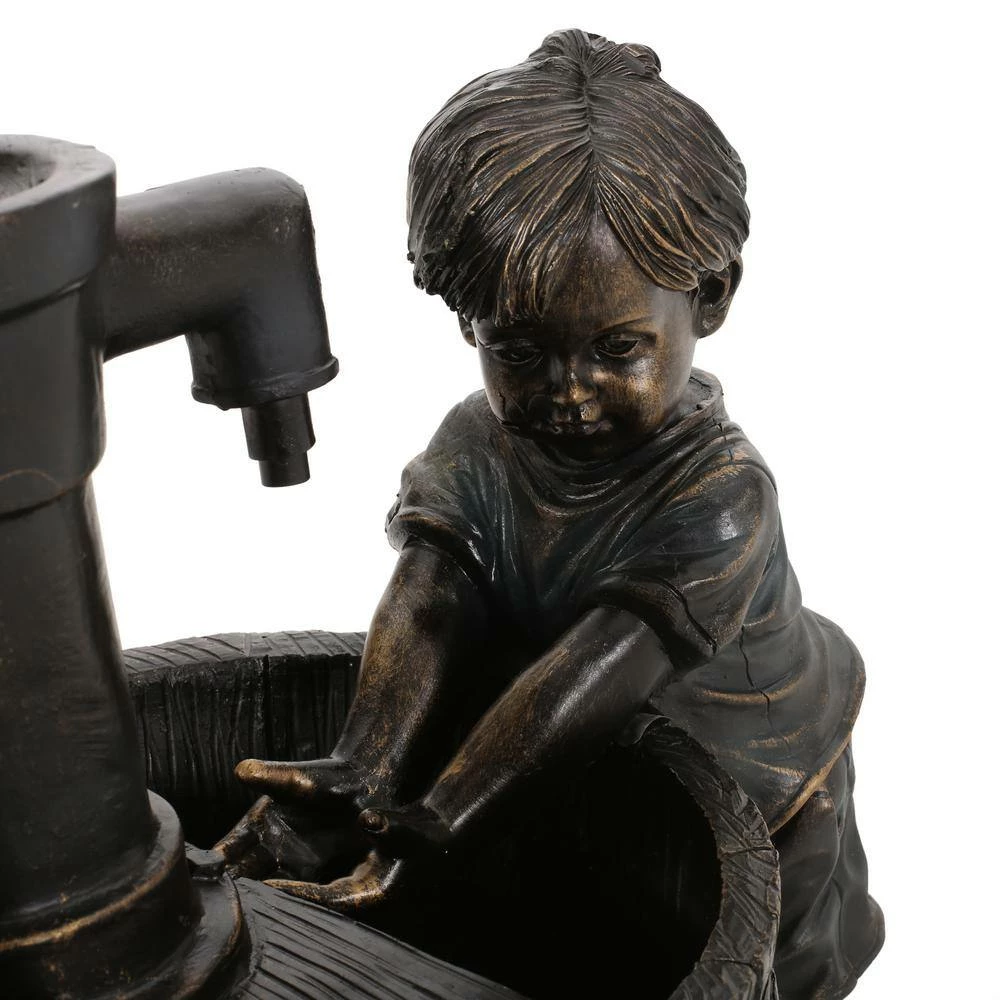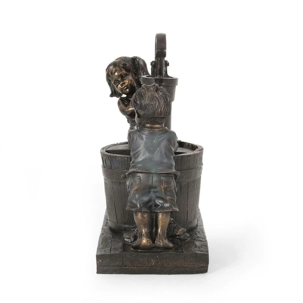 Fill your outdoor space with the sounds of flowing water and a spirited design that will brighten your decor. Our garden fountain features a calm waterfall flow that continuously circulates using an included pump, bringing a playful aura to any backyard or patio. Crafted with an incredibly durable polyresin material, this decorative accessory offers a weather-resistant structure that allows outstanding attention to detail. Finished with 2 children at a water pump, our water fountain is sure to add a touch of whimsy to your home.