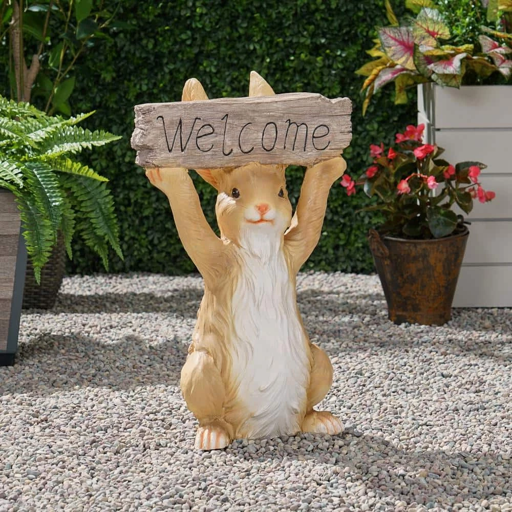 Greet your guests with an adorable companion that is sure to capture your heart with its charming design. Carefully crafted from cast stone, this statue features an adorable rabbit carrying a welcome sign above its head. This statue is created to have a durable structure and its weather-resistant properties make this a perfect addition to your backyard or patio space. Offering a lighthearted look to your garden or porch, this exquisite garden accessory will easily bring your decor to the next level.